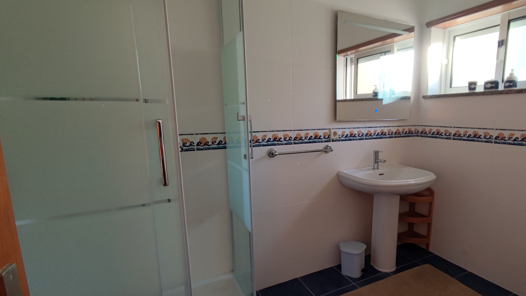Zeer ruime, compleet en modern ingerichte badkamer met wastafel, verlichte spiegel, toilet, bidet en douche.